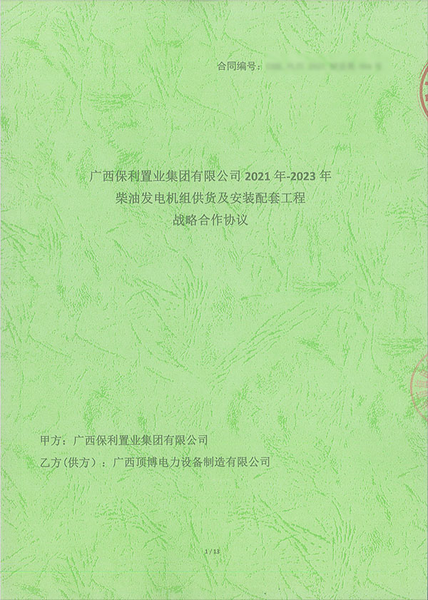 2021年7月26日,廣西頂博電力設(shè)備制造有限公司傳來喜訊,我公司成功與保利置業(yè)集團(tuán)成功簽訂2021年-2023年柴油發(fā)電機(jī)組供貨及安裝配套工程戰(zhàn)略合作協(xié)議,標(biāo)志著接下來的兩年時間內(nèi),作為戰(zhàn)略合作單位的保利集團(tuán)或其控股的各房地產(chǎn)公司或項目公司在建和即將開發(fā)項目的